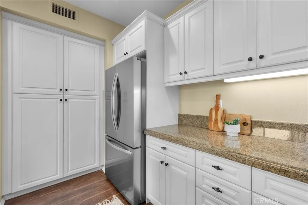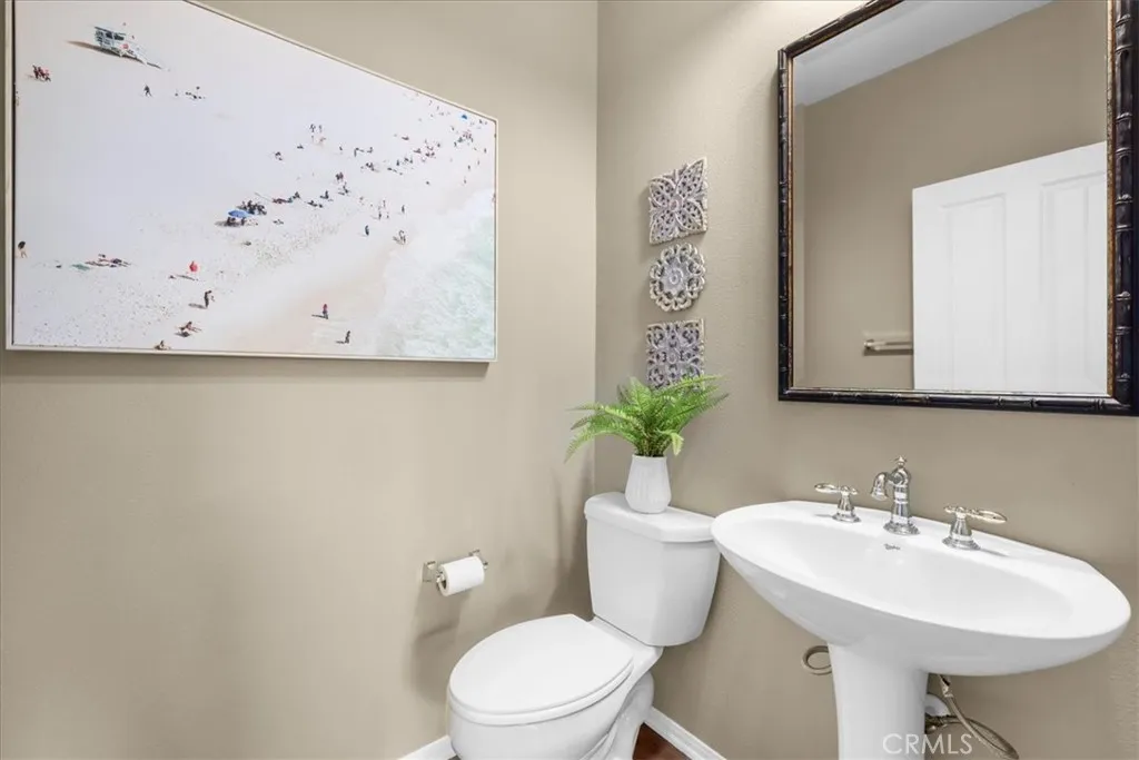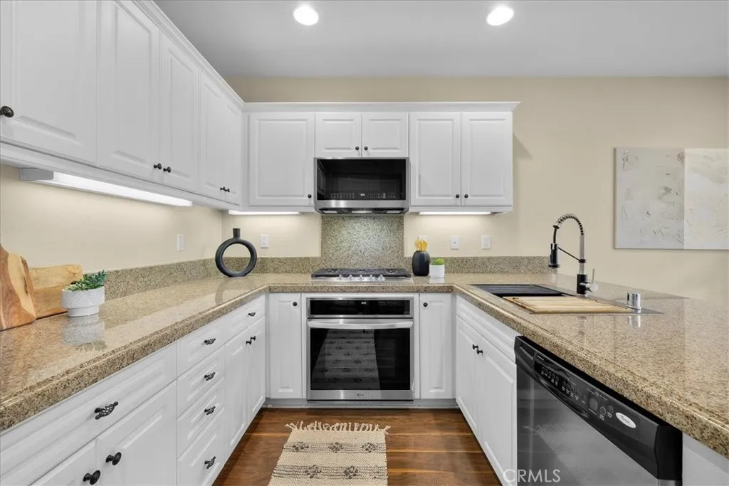 Continuing into the open concept kitchen is a large island/ breakfast bar with seating, a pantry, plenty of storage and granite counter tops. The kitchen also comes complete with new 2023 top of the line LG appliances including a 5 burner gas stove, microwave, refrigerator, and a sleek dark double wide stainless steel sink. The main level also features a powder room and bar nook.