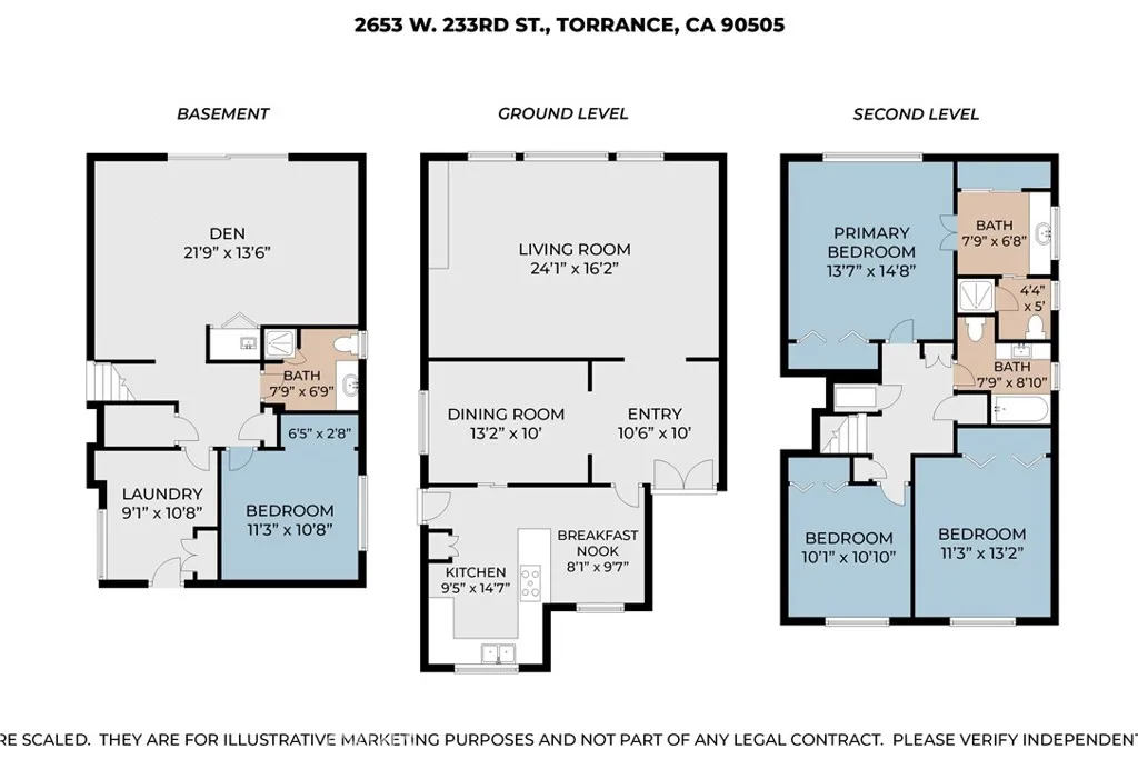 This classic, well-maintained, “Brentwood” floor plan is tucked away on a quiet, wide, interior street in the highly desirable Marble Estates neighborhood. These iconic homes, built in the 1960s by Don Wilson Builders are known for their popular “split-level” floor plan, spacious rooms, mid-century modern influence and underground utility lines. The generously-sized formal entry extends a warm welcome as you step into this lovingly maintained home (approx 2,556 sqft per Assessor) featuring 4 bedrooms, 3 baths, a spacious kitchen with breakfast nook, formal living and dining rooms in addition to an oversized “leisure room” or family room with hidden wet bar. The Brentwood floorplan is known for its large, separate laundry/utility room with direct access to the garage. The pride of ownership is evident as you walk into the kitchen filled with natural light from all directions. The cabinets glisten and sparkle as they did when they were built! The stunning living room with vaulted ceilings, handsome fireplace and giant picture window is a pleasant backdrop for entertaining morning, noon and night. The formal dining room, located off the kitchen, is a great space for a comfortable office or quiet study. Don’t miss the various iconic features from the 1960s, including the wired intercom/radio units in the kitchen and bedrooms, the laundry chute in the upstairs closet and geometric panels for added privacy in the primary bedroom dressing/vanity area. Invisible upgrades include newer windows, furnace and air conditioning unit and water leak detection system. This floor plan is ideal for multi-generational living as the bottom floor, which is accessible from the garage, has one bedroom, a bath with a shower and endless possibilities using the space from the adjoining family room. Close to award-winning Hickory Elementary and Hickory Park and centrally located near Del Amo Mall, Willson Park, shopping and dining. Must see to experience and feel the warmth of this highly sought-after neighborhood and to appreciate all the possibilities to make this your FOREVER HOME! Once you move in, you’ll never want to leave…